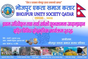 दोहा,कतार- भोजपुर एकता समाज कतारको प्रथम अधिवेशन आगामी शुक्रबार हुने भएको छ । “सेवा र सद्भाव, भोजपुर एकता समाजको आधार” भन्ने मुल नारा सहित बद्री तामाङको संयोजकत्त्वमा सन् २०२५ मा...[...]