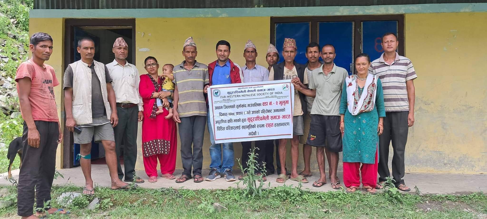 दिनेश खड्का’खप्तडी’अछाम।तुर्माखाद गाउँपालि वडा नं २ मा केहि महिना अगाडि आएको बाडि-पहिरो बाट जन धनको क्षेति गुमाएका अम्मर बहादुर बिष्टको परिवारलाई सुदूरपश्चिमेली नेपाली समाज भारतले नेपाली रु ५२ हजार ४ सय १६ रुपैयाँ आर्थिक सहयोग हस्तान्तरण गरेको छ ।