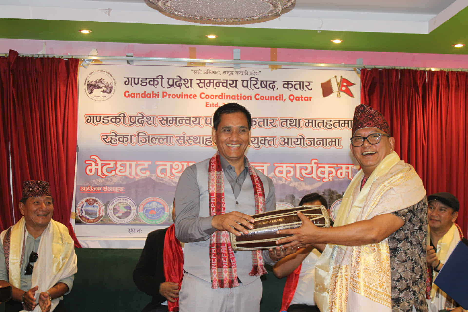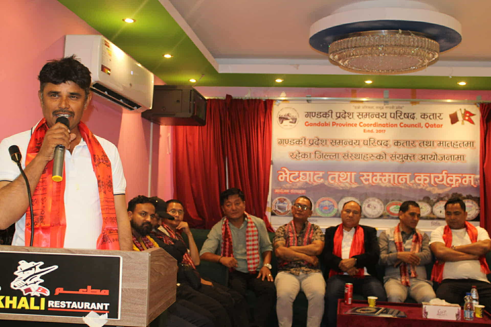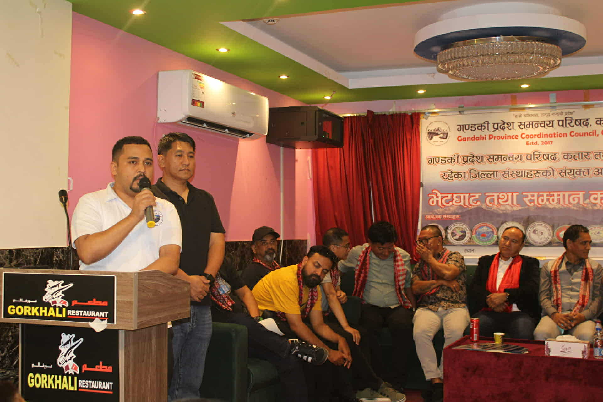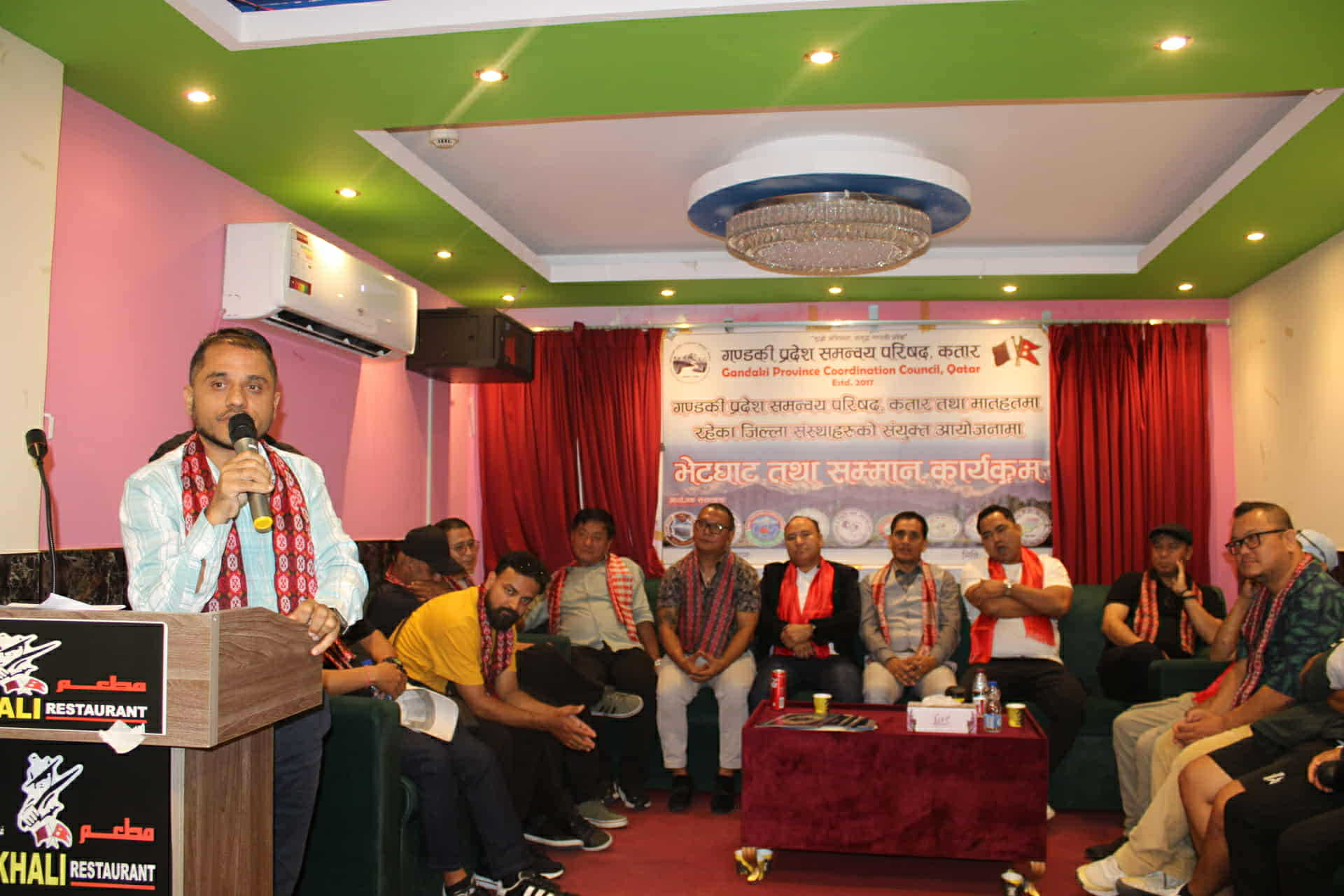 गण्डकी प्रदेश समन्वय परिषद कतारका अध्यक्ष नन्दलाल विश्वकर्मा (अजय) को अध्यक्षतामा सम्पन्न भएको कार्यक्रममा स्वागत मन्तव्य उपाध्यक्ष कल्याण थापा र कार्यक्रमको सहजीकरण महासचिव मनप्रसाद राना मगरले गर्नु भएको थियो ।