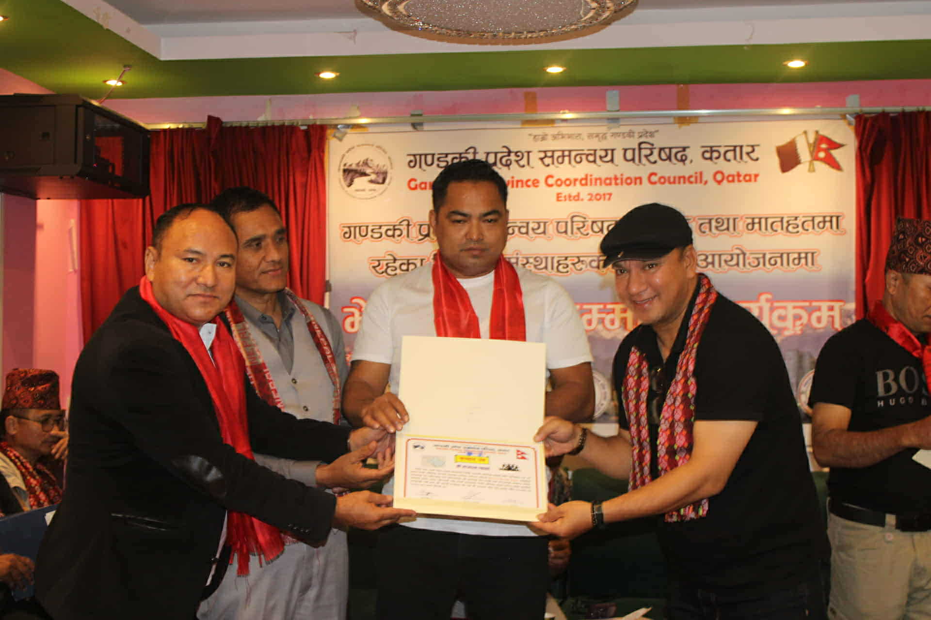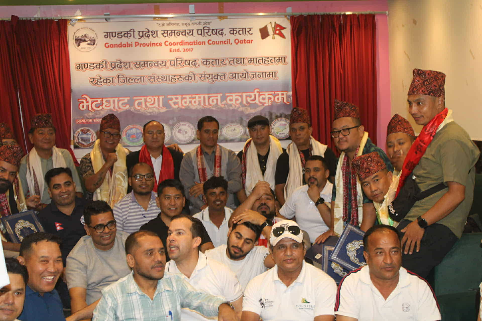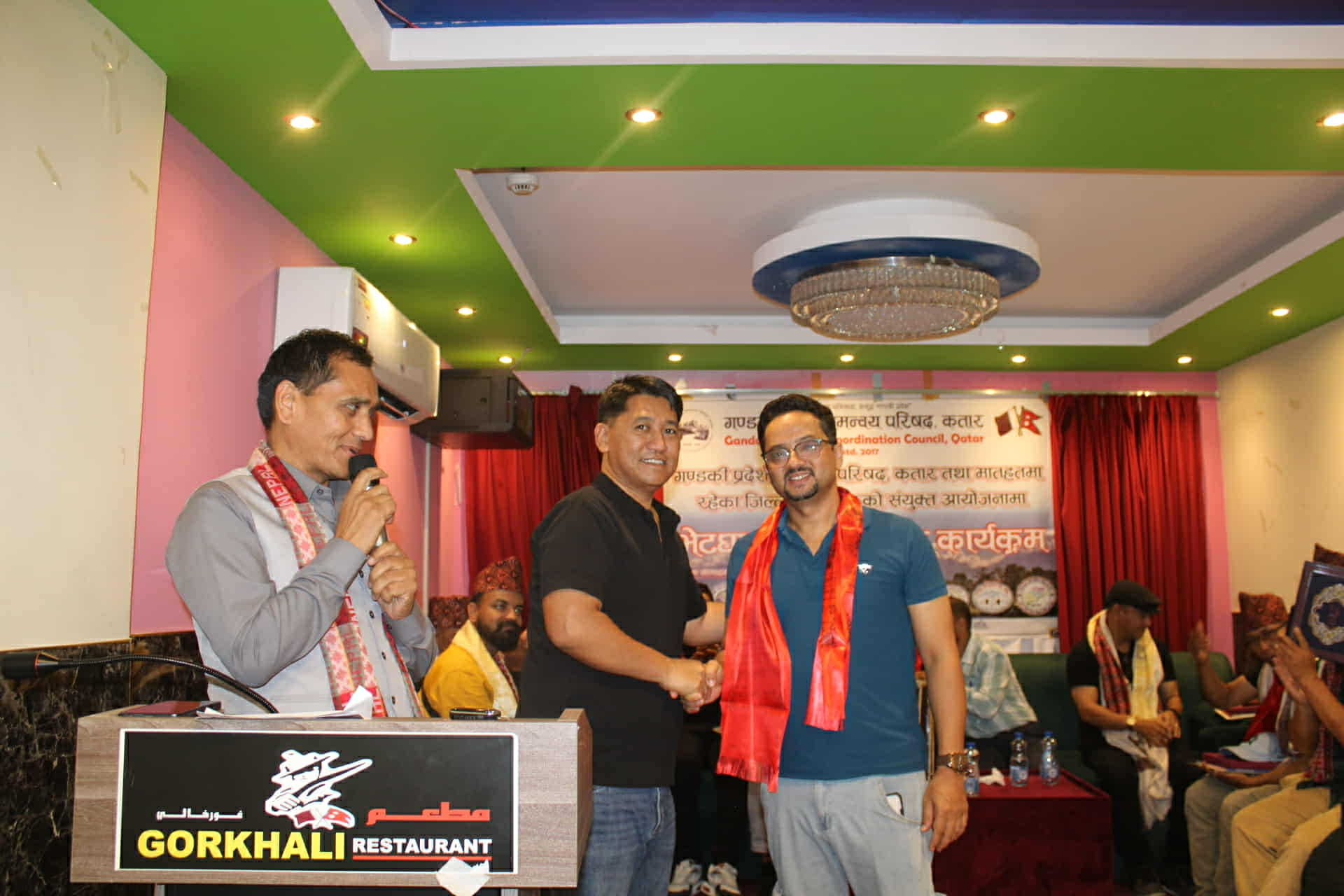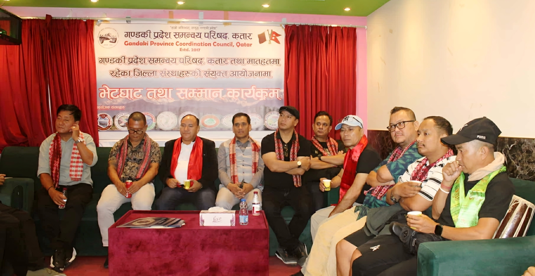 गण्डकी प्रदेश समन्वय परिषद कतारका अध्यक्ष नन्दलाल विश्वकर्मा (अजय) को अध्यक्षतामा सम्पन्न भएको कार्यक्रममा स्वागत मन्तव्य उपाध्यक्ष कल्याण थापा र कार्यक्रमको सहजीकरण महासचिव मनप्रसाद राना मगरले गर्नु भएको थियो ।