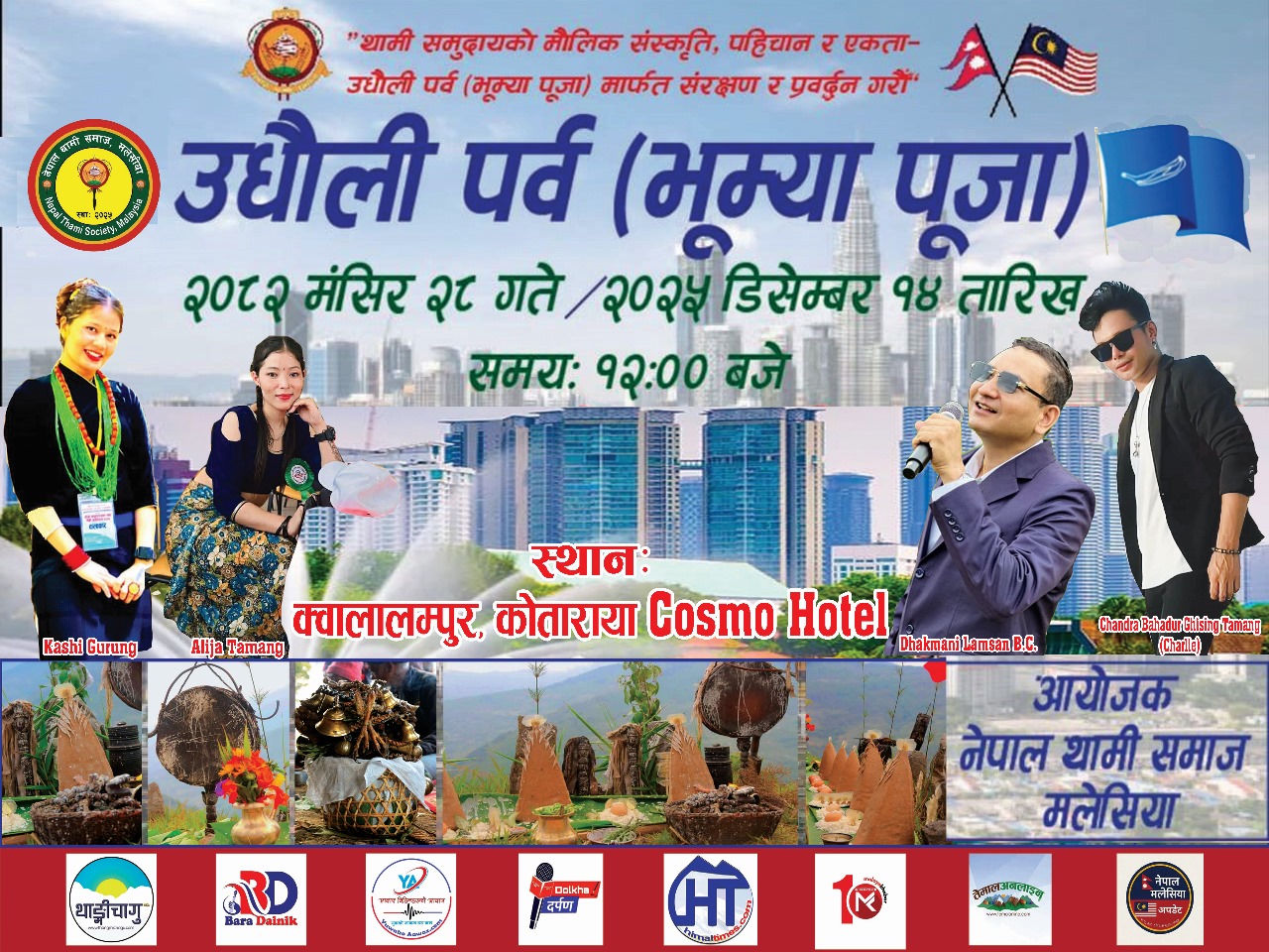 क्वालालम्पुर, मलेसिया । नेपाल थामी समाज मलेसियाले यस वर्ष उधौली पर्व (भुम्या पूजा)–२०८२ मलेसियामै पहिलोपटक भव्य रूपमा मनाउने भएको छ। कार्यक्रमका लागि आवश्यक सबै तयारी पूरा भएको अध्यक्ष सन्तोष ठान्टी थाङ्मीले जानकारी दिनुभयो।