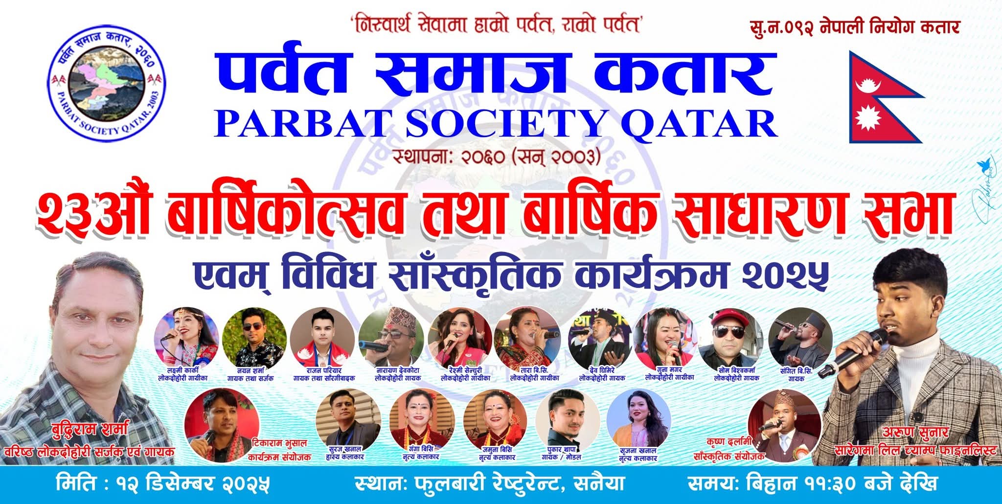 उक्त कार्यक्रमको लागि नेपालबाट आमन्त्रित वरिष्ठ लोक तथा दोहोरी गायक तथा सर्जक बुद्धिराम शर्मा र सारेगम लिल च्याम्पका फाइनलिस्ट गायक अरुण सुनार कतार आउने भएका छन भने शर्मा र सुनार सङ्गै कतारमै रहेका झन्डै डेढ दर्जन नेपाली कलाकारको उत्कृष्ट गायन तथा नृत्य प्रस्तुतिहरु समेत रहने कार्यक्रम संयोजक टिकाराम भुषालले बताउनु भयो ।