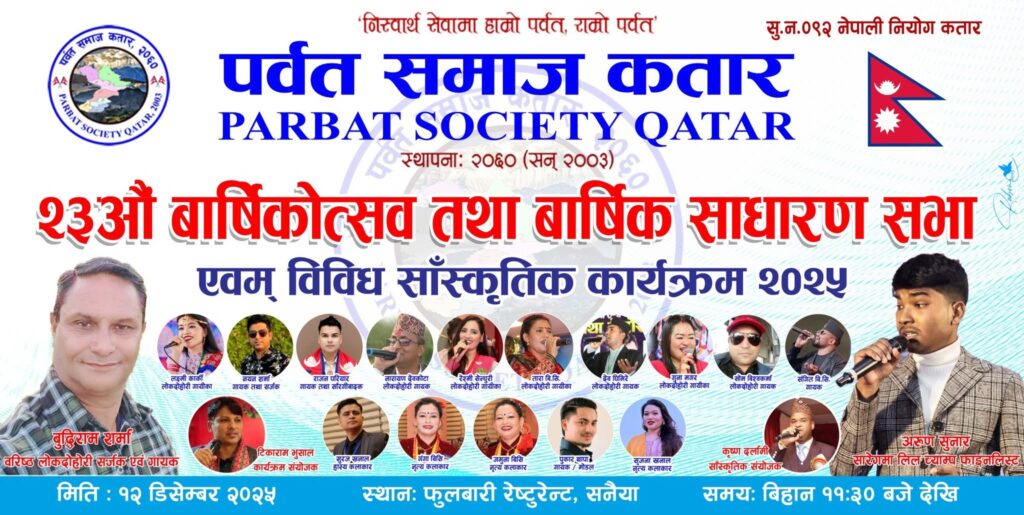 समाजले आगामी १२ डिसेम्बर शुक्रबारको दिन कतारमा रहेर नेपाली कलाकारितालाई निरन्तरता दिंदै आएका करिब एक दर्जन कलाकारहरुको सांङ्गीतिक प्रस्तुतिहरु सहित सहानिया स्थित अल-दोसारी पार्कमा नयाँ वर्ष २०२६ को अवसर पारी शुभकामना आदानप्रदान सहितको बृहत बनभोज कार्यक्रम २०२५ आयोजना गर्न लागेको समाजका वरिष्ठ उपाध्यक्ष तथा कार्यक्रम संयोजक सुर्य बहादुर खत्रीले जानकारी गराउनु भएको छ ।