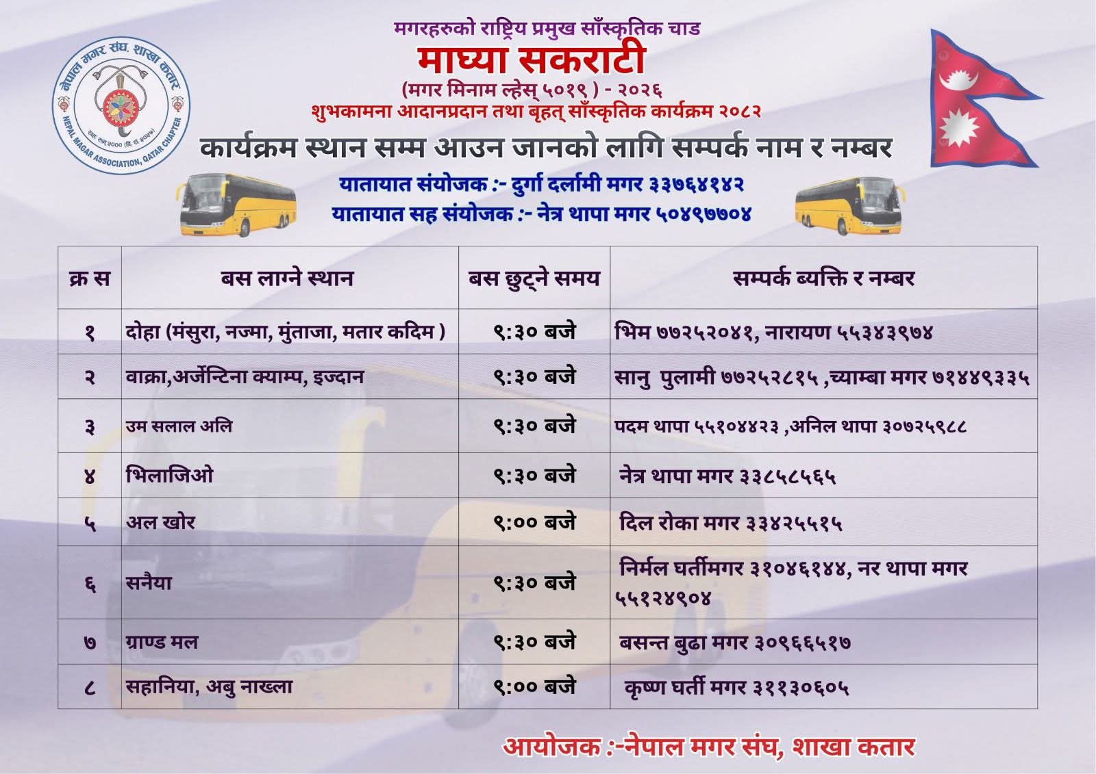 संघले हरेक वर्ष झै यो वर्ष पनि दोहामा स्थापित विभिन्न संघ संस्था, वैचारिक संस्था, सामाजिक व्यक्तित्व, समाजसेवी बुद्धिजीवी, व्यवसायी, कलाकार, पत्रकारहरु सम्पुर्णलाई उपस्थितिको लागि पत्राचार गरि सकेको र माघ्या सकराटी मगरहरुको मात्रै नभई समग्र नेपाल र नेपालीहरुको एउटा महान राष्ट्रिय साँस्कृतिक चाड भएकोले दोहाबासी सबै नेपालीहरु उपस्थित भएर कार्यक्रम सफल बनाउन सहयोग गरिदिन पनि आग्रह गरेको छ ।